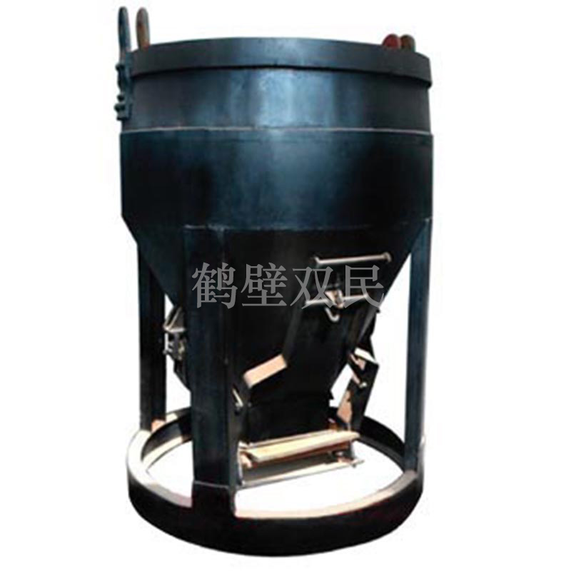 底卸式吊桶是放置在平底礦車、電力機車或其他牽引上,往返于井口棚與混凝土攪拌站之間。