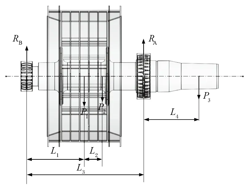 圖2 中,P1 為鋼絲繩動張力;P2 為主軸重力 +摩擦輪重力;P3 為電動機重力+磁拉力;L1 為非電動機端軸承中 心線到提升機摩擦輪中 心線的距離,L1=1 870 mm;L2 為提升機摩擦輪中 心線到重 心的距離;L3 為非電動機端軸承中 心線到電動機端軸承中 心線的距離,L3=3 800 mm;L4 為電動機端軸承中 心線到電動機中 心線的距離,L4=1 850 mm;RA 為非電動機端 (非傳動側) 軸承承受的支反力,數值與軸承所受徑向力相同,方向相反;RB 為電動機端 (傳動側) 軸承承受的支反力,數值與軸承所受徑向力相同,方向相反。